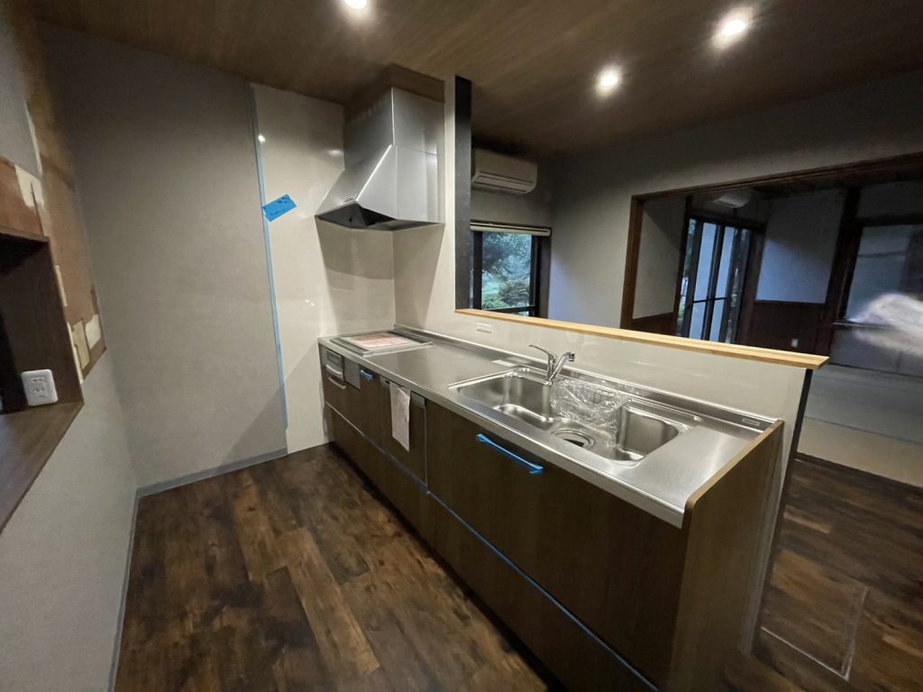 キッチン、洋室クッションフロア施工、キッチン・洋室壁紙張り替え、畳撤去、床仕上げ施工、洋室合板上張り施工、 キッチン扉・吊り戸扉リアテックシート施工