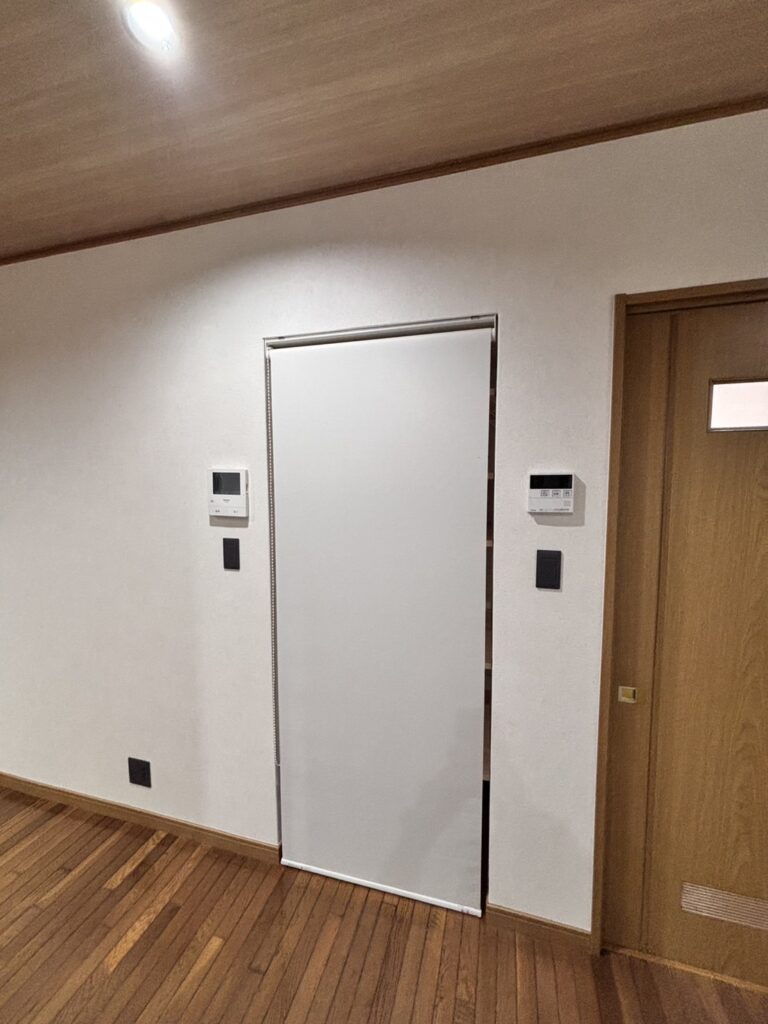 見た目を考え、ロールスクリーンを取り付けさせていただき、収納の目隠しとしました。