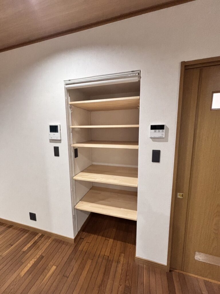 元々の冷蔵庫スペースは、簡易収納庫へ用途チェンジをして、食品などちょっとしたものを入れることができる収納スペースへ変更しました。